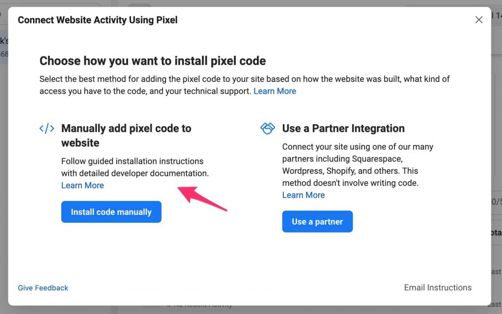 You’ll be prompted with installation instructions now. If you’ve already created a Pixel earlier, hit Add Events, then From a New Website to bring up this popup.