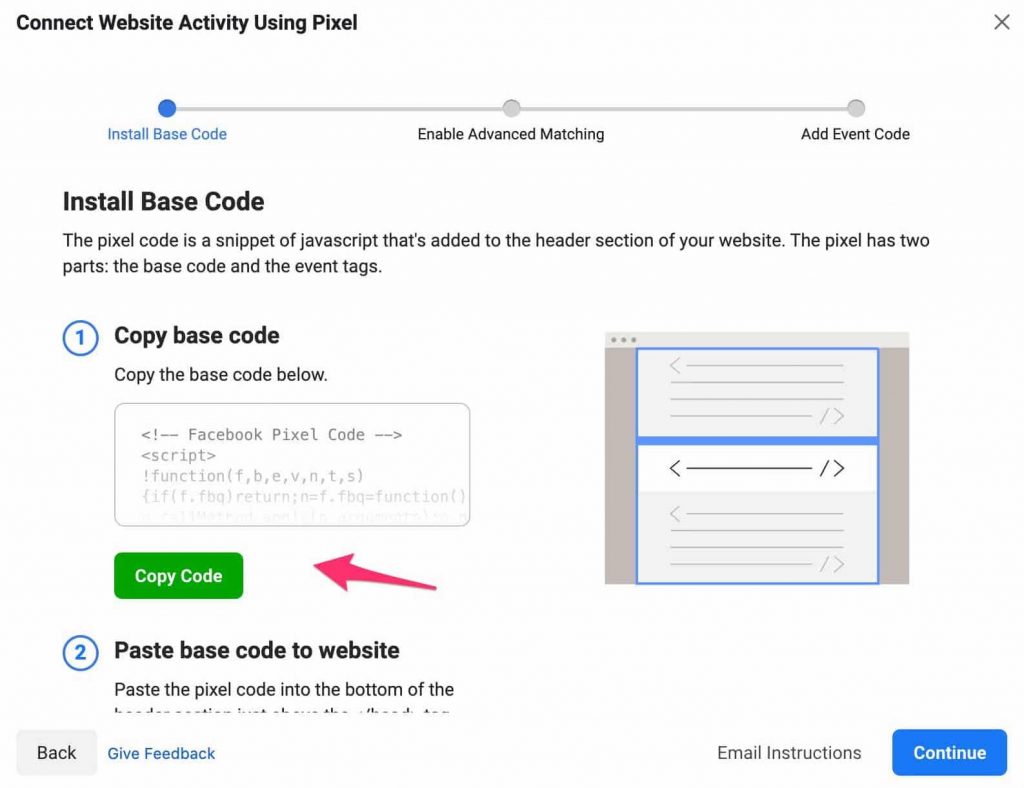 Next, copy the Pixel base code. Take this code and paste it into your WordPress site’s code.
