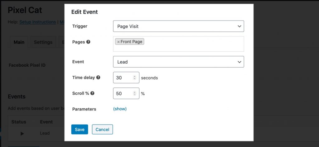 (The Pro version of Pixel Cat also lets you set up advanced triggers, such as click or hover on a particular element, as well as setting a time delay or scroll % before the event triggers).