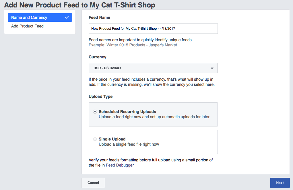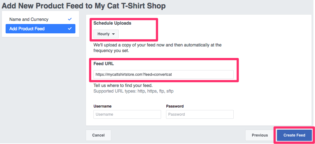 Select your new product catalog and choose Add Product Feed. Choose your Feed Name and Currency. Under Upload Type, choose Scheduled Recurring Uploads. Click Next.