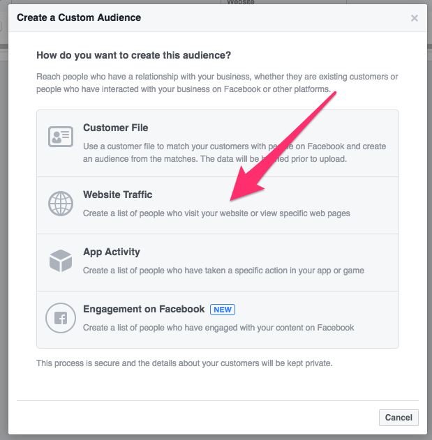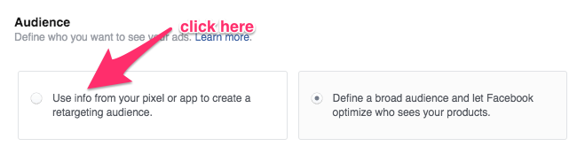 Click on “Use info from your pixel or app to create a retargeting audience.”