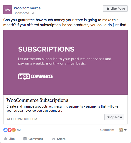 For example, after browsing the WooCommerce.com site and viewing their “Subscriptions” extension, you might see this ad in your Facebook feed.