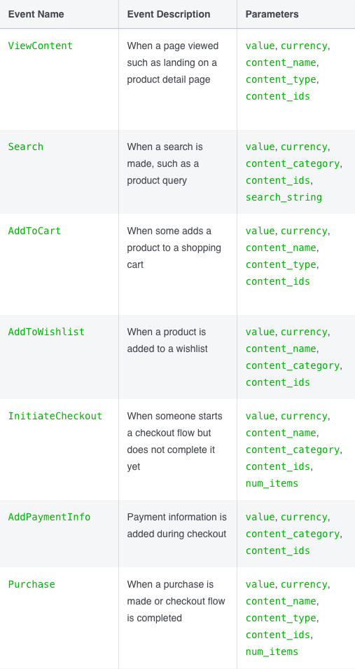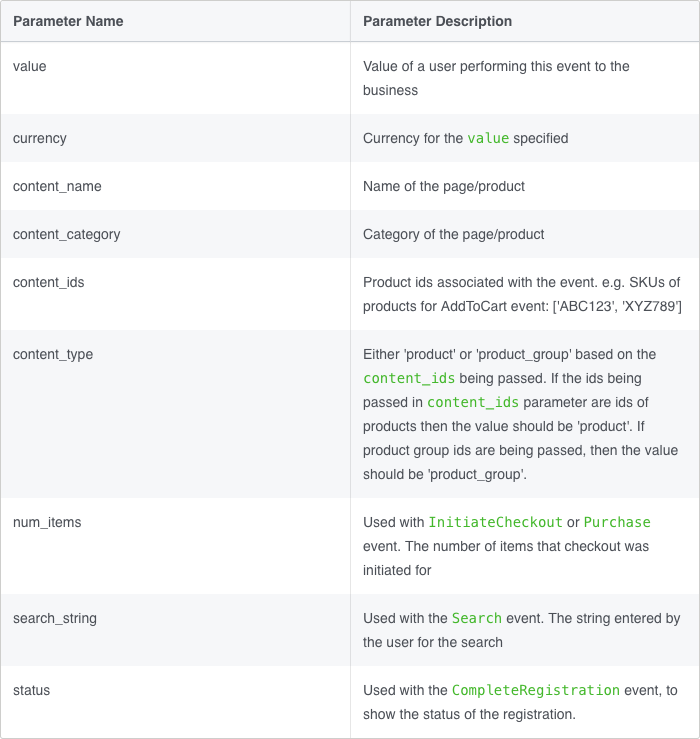 Each Standard Event comes with a list of optional (and, sometimes, required) parameters. Parameters contain useful information such as $ value of a purchase event, or the search query of a search event.