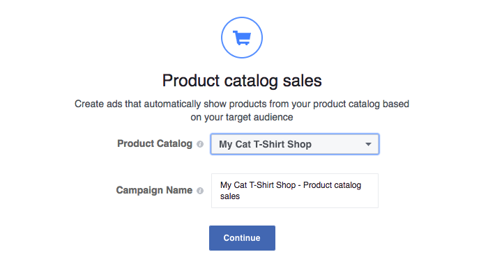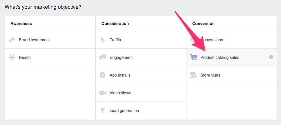 In the Facebook Ad Manager, create a new ad. Choose Product catalog sales.
