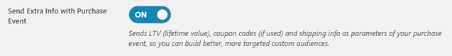 Once enabled we will send your customers ‘lifetime value’, any coupon codes, and any shipping information provided at checkout, as extra parameters. This gives a lot more ability to create highly targeted custom audiences.
