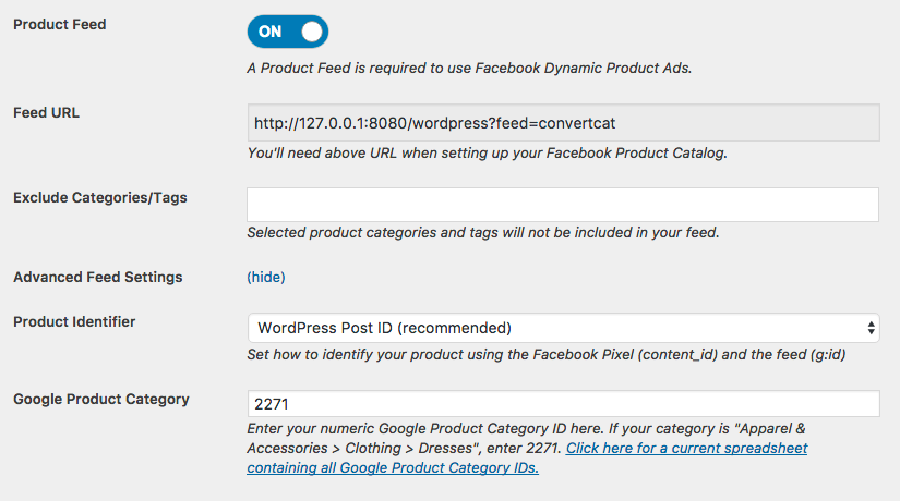 Google Product Category (Optional): Enter your Google Product ID here. You can learn more about Google Product IDs here. (Leaving this empty will result in Facebook displaying a warning “google_product_category – A product is missing a field”. It’s recommended you enter a product category id that matches your store.