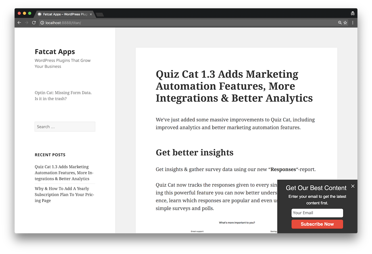 Content Upgrades are proven to increase conversion by up to 785%. That's why, as a blogger or content marketer, Content Upgrades are the best way to massively grow your list. Optin Cat makes it incredibly easy to add Content Upgrades to your WordPress site. Learn More >>