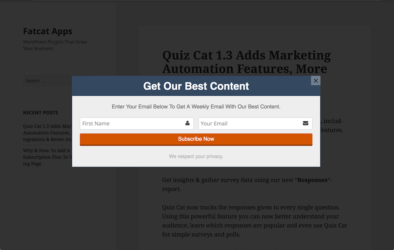 The days of dumb popups that appear instantly are over - there’s a better way. Optin Cat’s best-in-class targeting engine (Targeting Cat) lets you build advanced Popups, Slide Ins and Optin Bars that are triggered exactly when your user is most likely to subscribe. Learn More >>