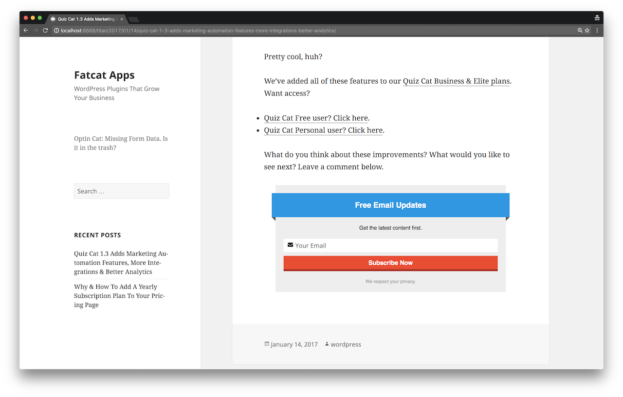 “Optin Cat is the 80/20 of email opt-ins. It lets you set-up the most valuable, highest converting email opt-in boxes quickly and easily. Using the end of post opt-in, I've almost doubled my email list in the past three months.”