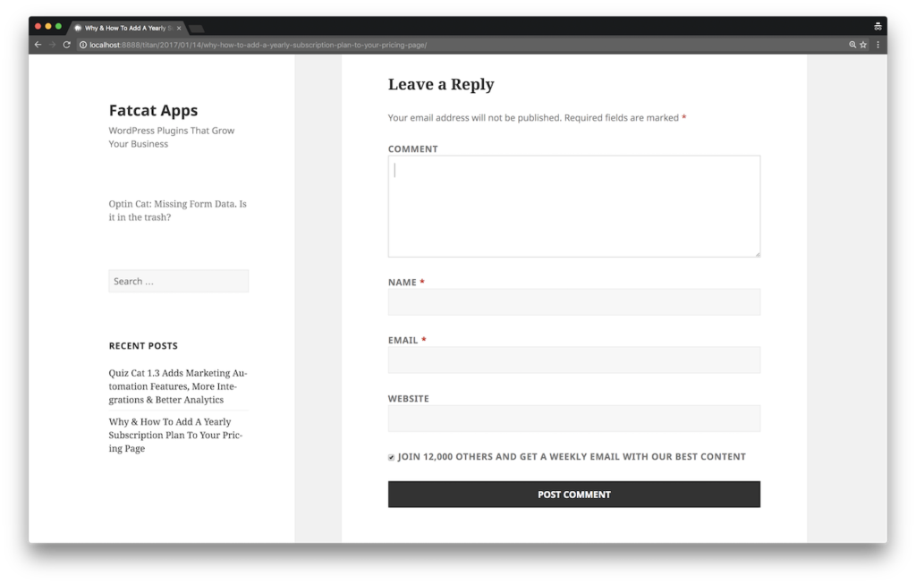With a single click, Optin Cat lets you add an email signup checkbox to your WordPress comment form. Pretty cool, huh?