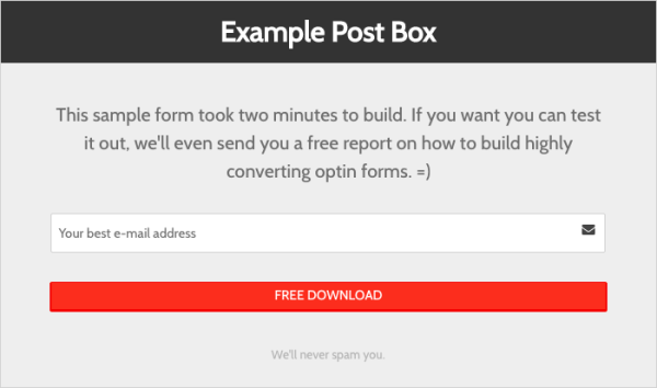 Adding optin forms to your posts is easy with our in-line Post Boxes. Simply choose a layout, style it with our point & click builder and it add to your blog. You can add your Post Box manually to a post or page using a shortcode. Or, you can automatically add your Post Box it to the bottom of all of your posts, or all posts of a specific tag or category, with a single click.